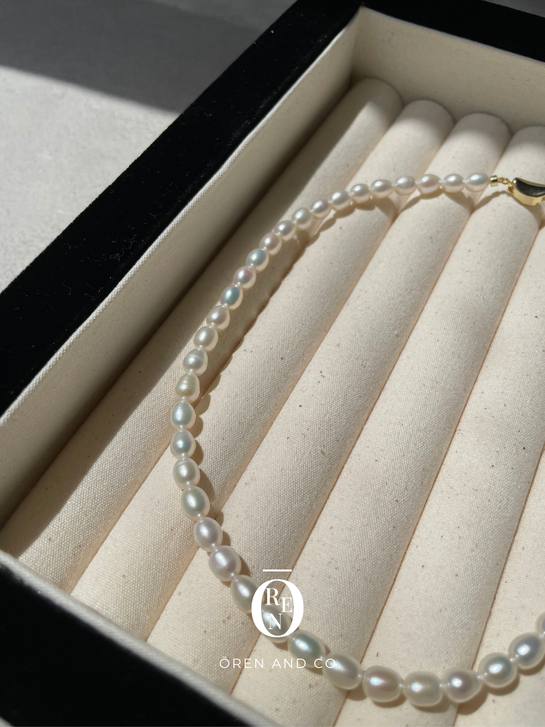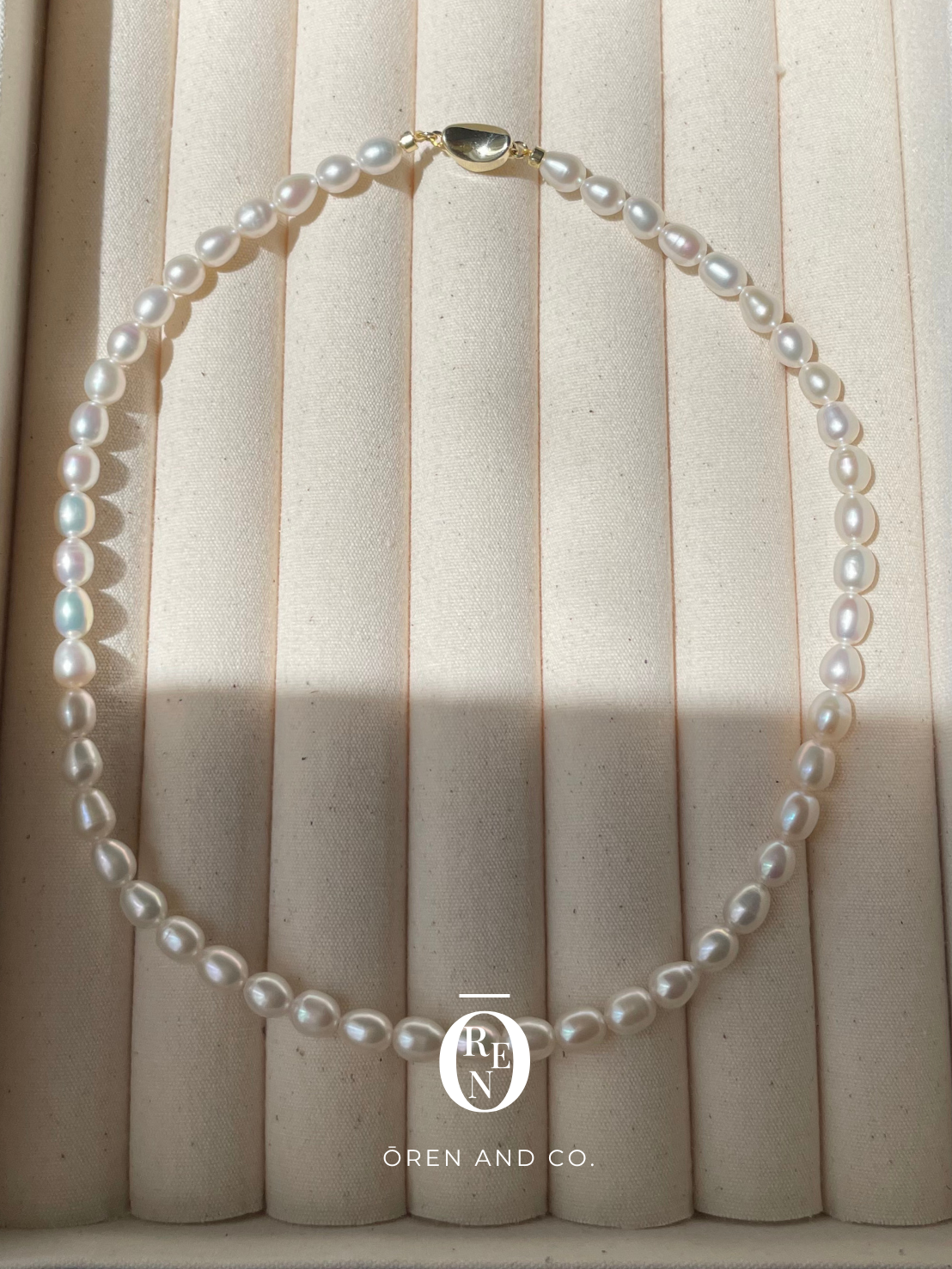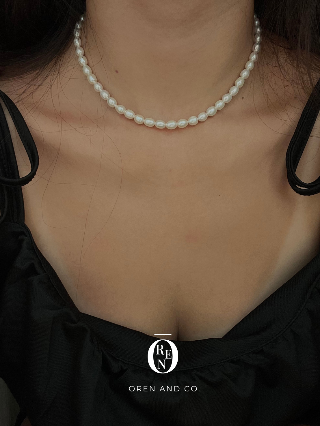 這款項鍊由 5-6mm 的天然長米珠串成,每顆都擁有獨一無二的天然螺紋與光澤。