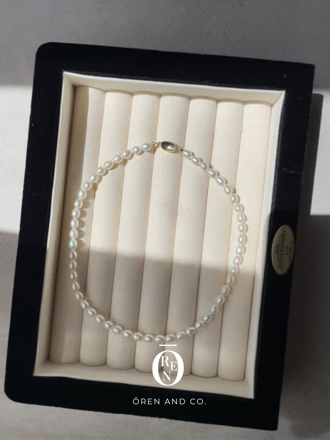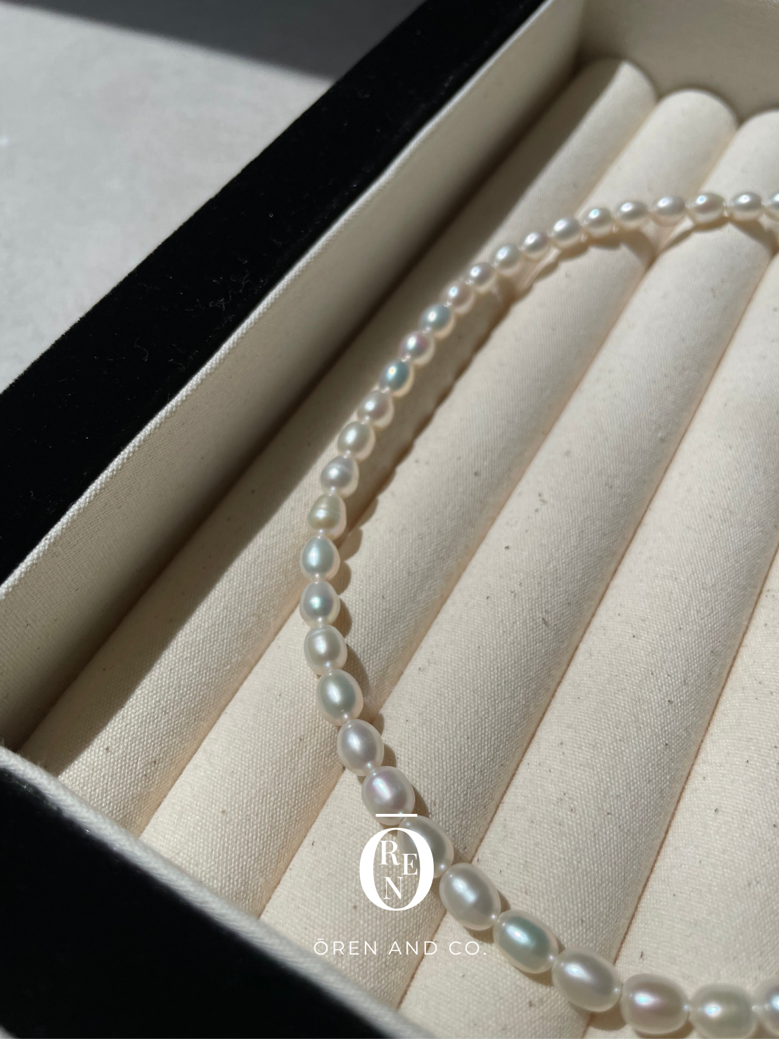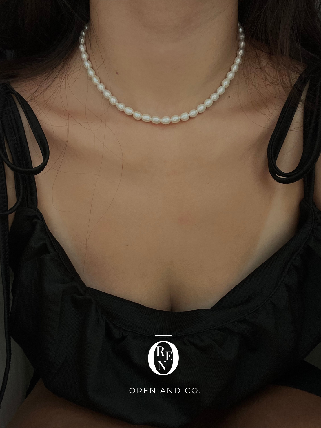 這款項鍊由 5-6mm 的天然長米珠串成,每顆都擁有獨一無二的天然螺紋與光澤。