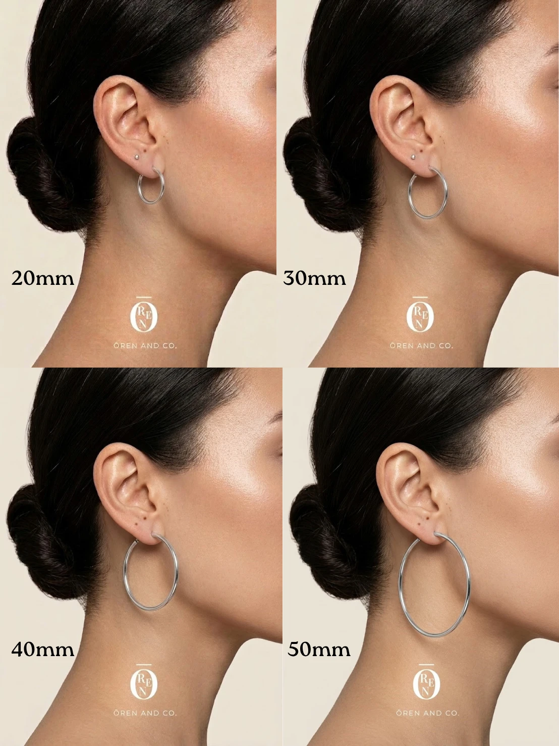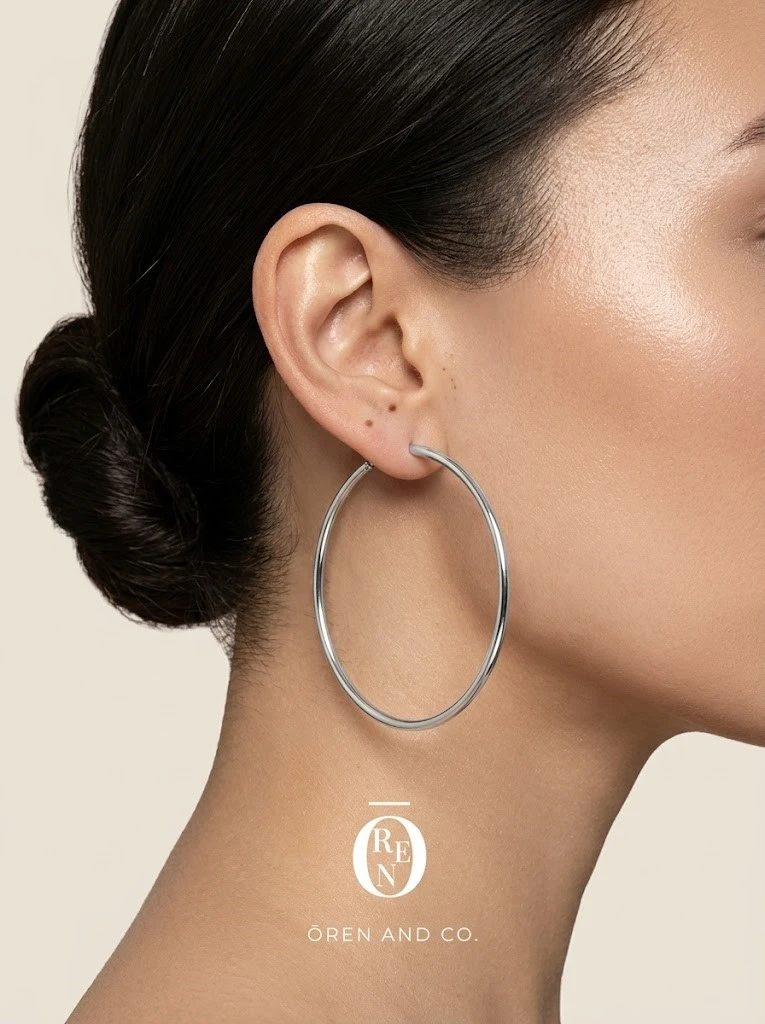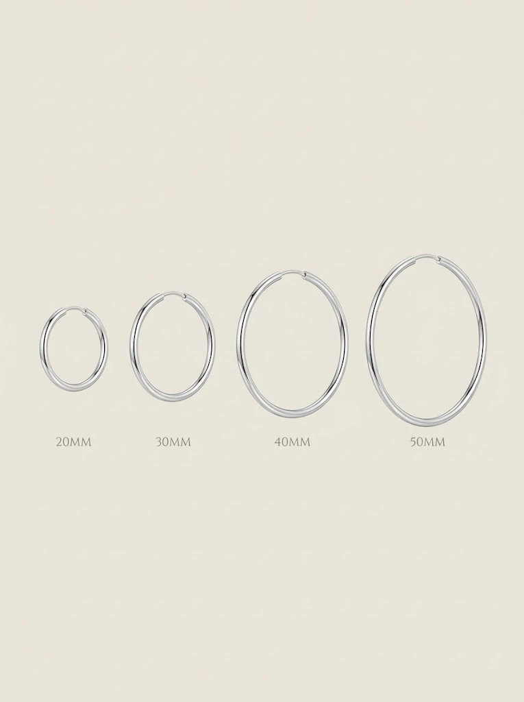 此款耳環採用無縫環圈設計,無需扣合。穿戴時,將銀針穿過耳洞後,直接插入耳環上的洞口,即可固定。(上圖佩戴為50mm)